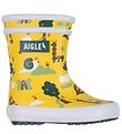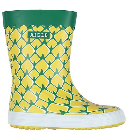 Lækre Aigle gummistøvler i gul og grøn med ananas mønster. Omkring sålen er der en hvid kant. Bagtil er der en praktisk refleks.