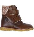 Søde Angulus vinterstøvler i mørkelilla skind, med et hulmønster i form af små hjerter på hælkappen og velcroremmene.