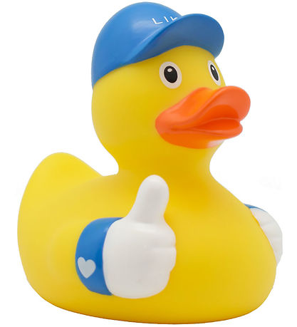 Sjov badeand i gul med en blå kasket der siger "LIKE" på fronten.