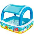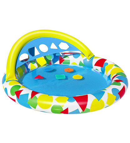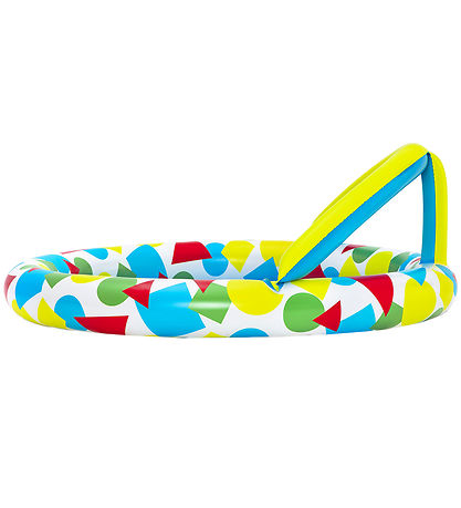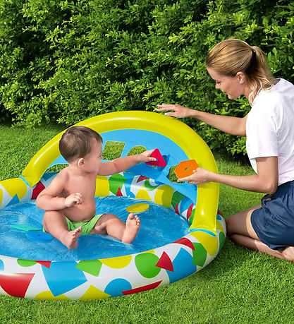 Fint Bestway legebassin med et print af firkanter, cirker og trekanter i blå, rød og neongrøn.