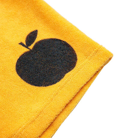 Seje Bobo Choses shorts i gul frotté med et print af et æble i mørkeblå på venstre ben.