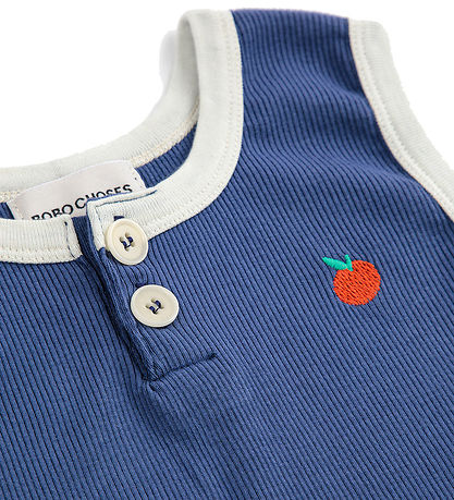 Skøn Bobo Choses sommerdragt i mørkeblå med hvide kanter og en rød broderet tomat på venstre bryst. Sommerdragten er i en lækker ribstruktur.