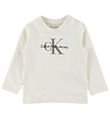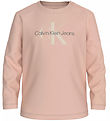 Attraktiv Calvin Klein bluse med lange ærmer i en lys beige farve. Blusen prydes af et stort logoprint fra Calvin Klein på fronten, hvilket giver et stilfuldt look.