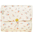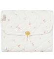 Flot Cam Cam Copenhagen pusleunderlag i hvid med et allover print af rosa og lysegrønne blomster med et flot quilted design. Indvendigt er underlaget rosa og den har også en flot guldknap.