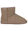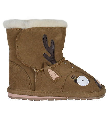 Fine EMU Australia bamsestøvler i brunt ruskind, og på foden er den dekoreret som en sød hjort.