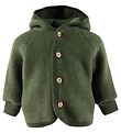 Engel cardiganen har en fast hætte og en gennemgående knapåbning med fine træknapper. Der er ribkanter omkring alle åbninger.