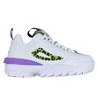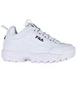 Skønne Fila sko i hvidt mesh og imiteret læder med detaljer i blå og sølv samt et blåt logo på ydersiden af skoene.