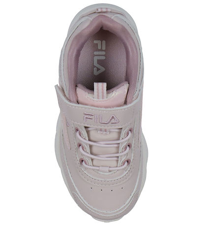 Fila skoene har elastiske snøre over vristen og lukkes øverst med en velcrorem. Skoene har mørk rosa tekstil på indersiden, og de har bløde, udtagelige indersåler. Skoene har kraftige og fleksible ydersåler, som er lavet i et letvægtigt materiale.