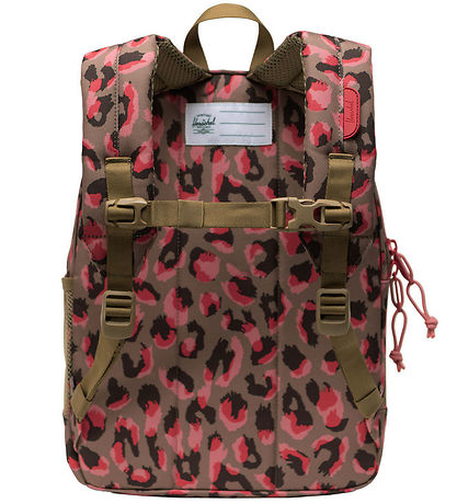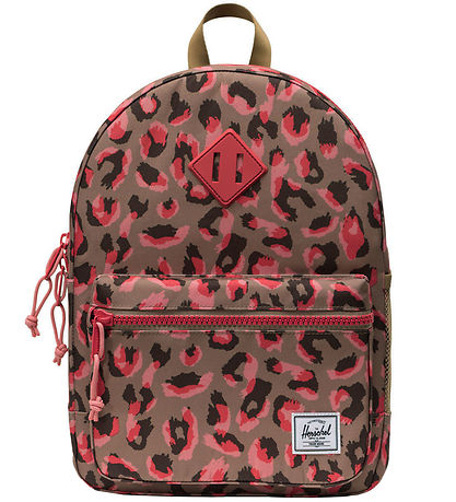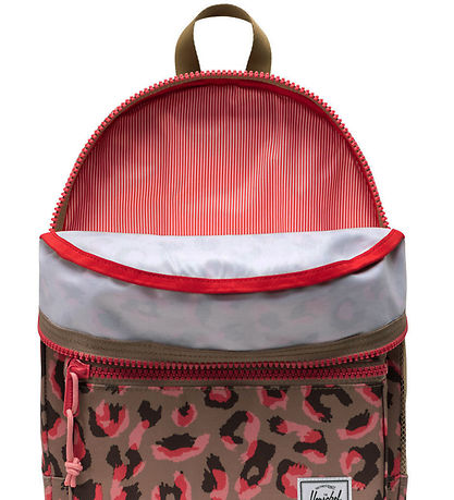 Fin Herschel Herschel rygsæk i lysebrun med et leopardprint i rosa, rød og sort. Der er et rosa gummilogo og en hvid logopatch fortil. Rygsækkens inderside har et flot print af røde og hvide striber.