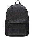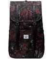 Fin Herschel rygsæk med et alloverprint af blade i sorte, brune og grå nuancer. Rygsækken har stropper i sort, imiteret læder fortil med metalspænder. Foran er der en hvid logopatch. Indvendigt har rygsækken et stribet for, der matcher rygsækkens ydre.