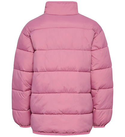 Praktisk Hummel dynejakke i pink med vandrette syninger. I venstre side er der et logorefleksprint.