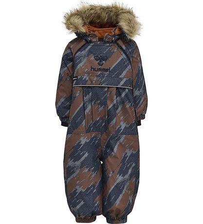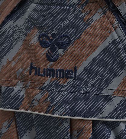 Flot Hummel flyverdragt med et skraveret, camouflagelignende print i navyblå, brune og gråblå nuancer. Flyverdragten har et navyblåt, broderet logo på brystet, og ned langs ærmerne er der logovinkel-bånd i navyblå og brændt orange.