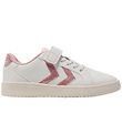 Flotte Hummel sko i hvid med Hummel-vinkler i rosa glimmer på siderne, samt samme rosa glimmer på hælen.