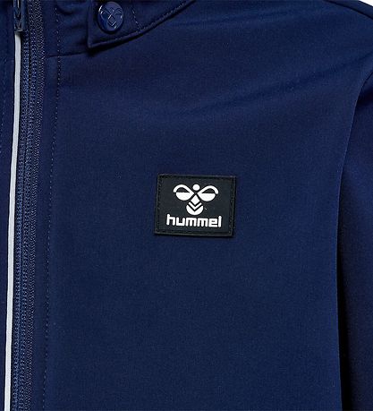 Flot Hummel softshelljakke i ensfarvet navy med en sort og hvid logoapplikation i gummi på venstre bryst.