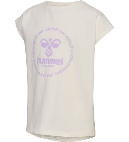 Yndig Hummel t-shirt i hvid, med mærkets logo og navn printet i rosa fortil, med teksten "Change The World Through Sport" to gange, formet i en cirkel.