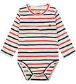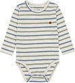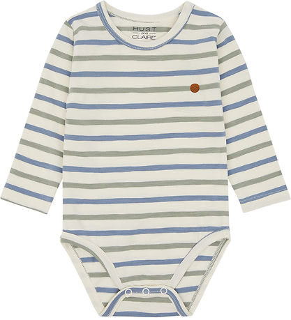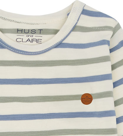 Praktisk Hust and Claire body i en lys beige farve med fine striber i blå og grøn nuancer. Bodyen har et lille label af et skib på brystet, der tilføjer et stilfuldt præg. Velegnet til hverdagens behov.