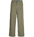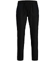 Jack & Jones bukserne har lange ben og åbnes fortil med en knap og lynlås. I taljen er der en justerbar elastikkant indeni samt praktiske bæltestropper udenpå. Fortil er der to åbne lommer i siderne og bagpå er der to yderligere lommer. Bukserne er fremstillet i en blød og strækbar kvalitet.