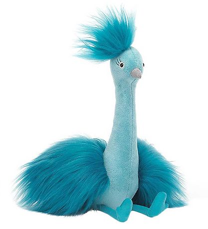 Flot Jellycat bamse som forstiller en påfugl i blå. Bamsen har en lang hals og lange ben. Derudover har den også pjusket vinger og hår.