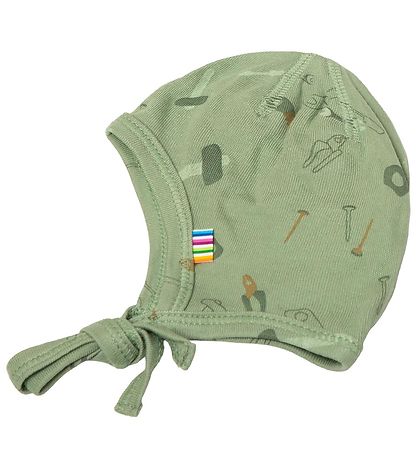 Sød Joha babyhjelm i støvet grøn med et flot værktøjsprint.