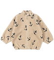 Skøn Konges Sløjd fleecejakke i støvet, blå teddyfleece med et alloverprint af rosa sløjfer.