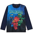Sej LEGO® Ninjago bluse i navyblå med et holografisk frontprint af avatarene til den blå og grønne ninja, Jay og Lloyd, fra LEGO® Ninjago: Prime Empire med teksten "Ninjago Multiplayer" under sig i hvid.