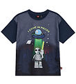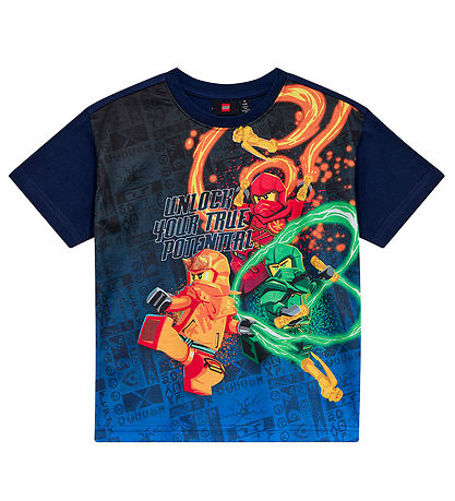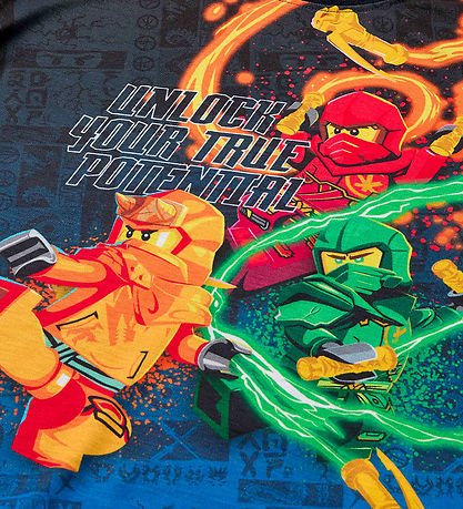 Smart LEGO® Ninjago t-shirt i navy, og på hele fronten er der et stort print med ninjaerne Arin, Lloyd og Kai.