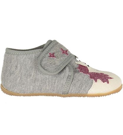 Dejlige Living Kitzbühel hjemmesko i gråt bomuld med to forskellige applikations-designs. På højre fod er en hvid enhjørning samt to stjerner på remmen over vristen, imens der på venstre fod er en sød regnbue-applikation i fine farver, samt to glitrende stjerner på remmen over vristen.