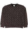 Charmerende bluse fra Mads Nørgaard med et flot strikket mønster. Blusen har lange ærmer og en rund halsudskæring. Farverne er i neutrale toner af grå og hvid med små, stilfulde korsmønstre. Designet fuldendes med grønne striber nederst, der giver et ekstra touch.