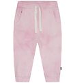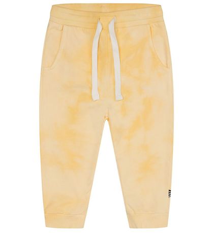 Flotte Mads Nørgaard sweatpants i gul med batikmønster og et logoprint i hvid på venstre bukseben.