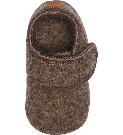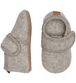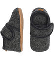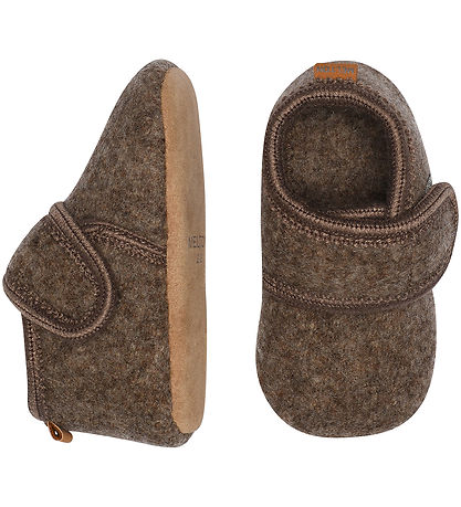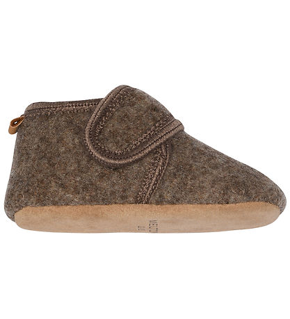 Melton hjemmeskoen har en bred velcrolukning over vristen og under bunden er der ruskind, så det er nemmere for barnet at stå fast.