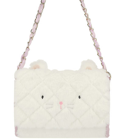 Yndig Meri Meri skuldertaske med form som sød kat i hvidt plys med ører, broderet ansigt og lilla kanter.