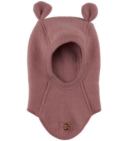 Dejlig Mikk-Line elefanthue af filtet uld i rosa. Elefanthuen har nuttede ører på toppen, og under hagen er der et brunt lædermærke med et Mikk-Line-logo.