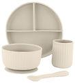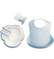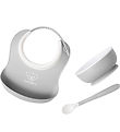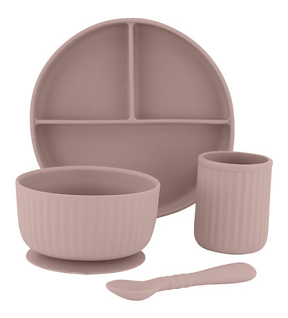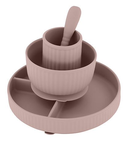 Mikk-Line tallerkenen er inddelt i 3 rum, så det er nemt at holde maden adskilt. Alle delene har en rillet struktur på ydersiden, som giver en godt greb, og skeen har et tykt skaft, så det lille barn, nemt kan holde på den. Som en smart detalje sidder der under tallerkenen og skålen en stor sugekop, som holder fast til bordet, når barnet øver sig på at spise selv. Spisesættet er lavet af fleksibelt silikone, og det er ideelt som barnets første spisesæt, da materialet ikke går i stykker, hvis det bliver tabt på gulvet.