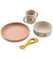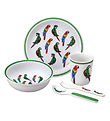 Spisesættet er fødevaregodkendt, og det kan tåle at komme i opvaskemaskinen og mikrobølgeovnen.