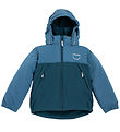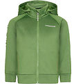 Minymo softshelljakken har en aftagelig hætte, som er fæstnet langs den mellemhøje halskrave ved hjælp af trykknapperl. I armåbningerne er der praktiske elastikkanter.