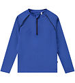 Badeblusen har korte ærmer, og den har en smal kant i halsåbningen.