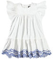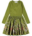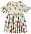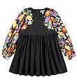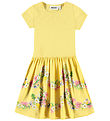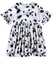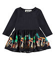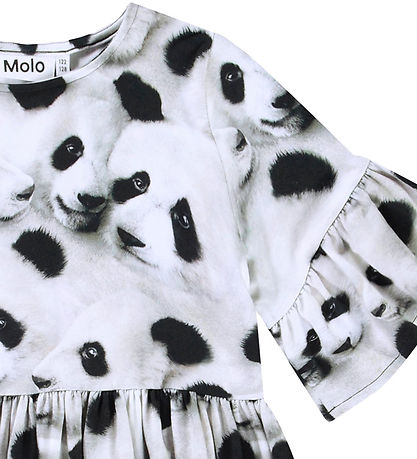 Unik Molo kjole med et iøjnefaldende print af pandaer i sort og hvid. Molo kjolen har korte ærmer med elegante, brede flæser, der skaber en let og luftig struktur. Skørtet har masser af vidde.