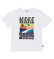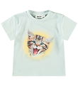 Charmerende Molo t-shirt i en lys beige nuance. T-shirten prydes af et simpelt print bestående af en smilende banan, der tilføjer et humoristisk touch. T-shirten fra Molo har smalle kanter, og den åbnes ved den venstre skulder med trykknapper.