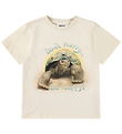 Fascinerende Molo t-shirt i en lys beige nuance. T-shirten har et detaljeret print af en UFO, der svæver over en frodig jungle med stråler ned mod jorden. Molo t-shirten har en klassisk rund halsudskæring, der fuldender et spændende og mystisk udtryk.