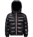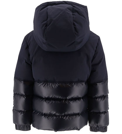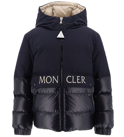 Smart Moncler dunjakke i mørk navy i glatvævet polyester med to forskellige udtryk, og fortil står der "Moncler" trykt med lysegrå bogstaver. Øverst på venstre ærme er der et filt-mærke med et Moncler-logo.