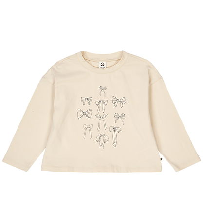 Stilfuld bluse fra Müsli med lange ærmer. Blusen er i en lys beige nuance med et tryk af forskellige sløjfer foran. Den har en rund halsudskæring og en enkel struktur, der giver et afslappet udseende. Müsli blusen er fremstillet med fokus på et simpelt og tidløst design.