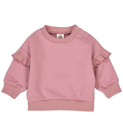 Elegant sweatshirt fra Müsli i en smuk rosa farve. Müsli sweatshirten har lange ærmer og flæsedetaljer over skuldrene, samt en rund halsudskæring med trykknapper på venstre skulder. Ribkanter ved håndleddene og nederst giver et klassisk udtryk. Sweatshirten har blødt, børstet bomuld på indersiden.
