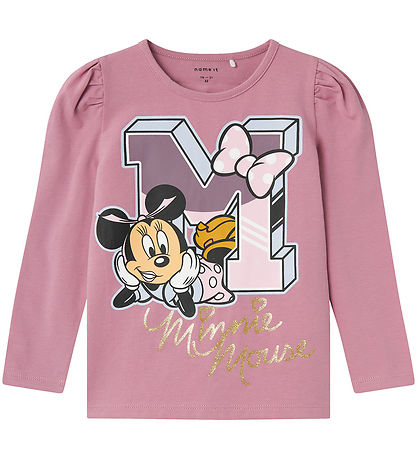 Charmerende Name It bluse i en lys rosa nuance med et farverigt Minnie Mouse print på fronten. Blusen har lange ærmer og let pufeffekt ved skuldrene, hvilket giver et fint og legende udtryk.