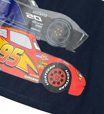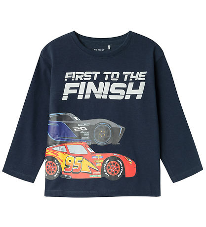 Fin Name It bluse i navyblå med et print af biler fortil, samt teksten "First to the finish" i hvid.
