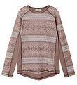 Lækker Name It bluse i gammelrosa med mønster på fronten og ærmerne i hvid, rosa og lilla. Blusen har en rund halsudskæring og lange ærmer. Den er fremstillet af blødt merinould.
