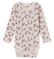 Fin Name It body med lange ærmer i et stribet mønster. Farverne er afdæmpede med nuancer af rosa og hvid. Bodyen er lavet i en blød struktur med fine blondekanter ved halsen og håndleddene. Bodyen er fremstillet af lækkert merinould.
