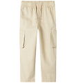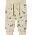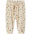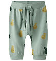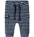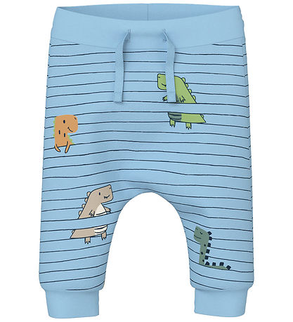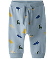 Smukke Name It bukser i en lys blå nuance med et farverigt dino- og stribedesign. Bukserne har en praktisk elastisk talje, der sikrer en god pasform til aktive børn.