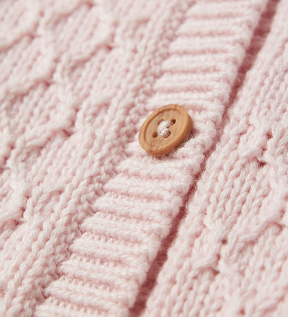 Fin Name It cardigan i lys rosa, med et flot strikket mønster.