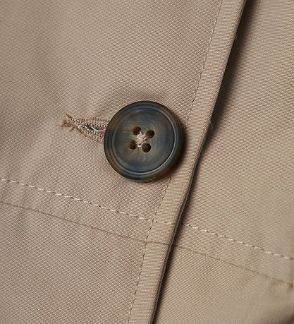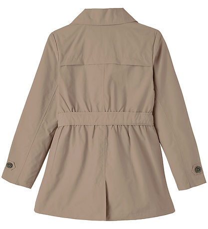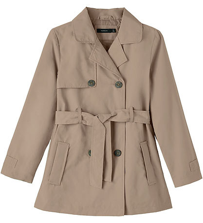 Name It frakken har klassisk, bred, ombukket krave og lange ærmer med dekorative remme med knapper. Frakken åbnes fortil med knapper i et dobbeltrækket design og ved højre skulder er der en lagdetalje, mens på tværs af skulderbladene er en foldekant. Frakken har åbne lommer i siderne på fronten. Rundt om taljen er der bindebånd.