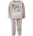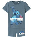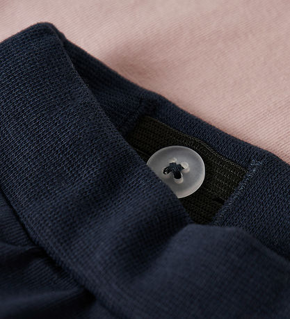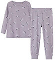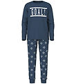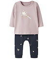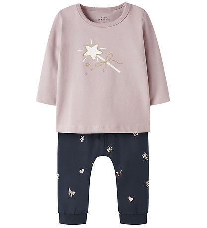 Charmerende Name It nattøj bestående af en rosa natbluse og et par navyblå natbukser. Nablusen har et fint print på fronten af en tryllestav og stjerner i guld glimmer og hvid, mens natbukserne har et alloverprint af små motiver i rosa og beige nuancer.